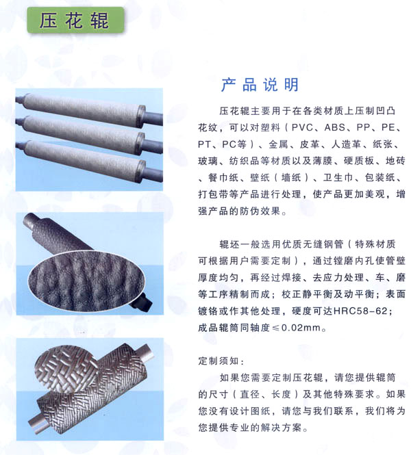 常州市武進(jìn)區(qū)禮嘉鎮(zhèn)萬超機(jī)械有限公司專業(yè)生產(chǎn)、加工花輥、鏡面輥、無紡布設(shè)備,及各類機(jī)械配件。產(chǎn)品廣泛應(yīng)用于金屬、塑料、皮革、紙張、玻璃、木材、無紡布、衛(wèi)生材料、包裝裝潢等行業(yè)。
