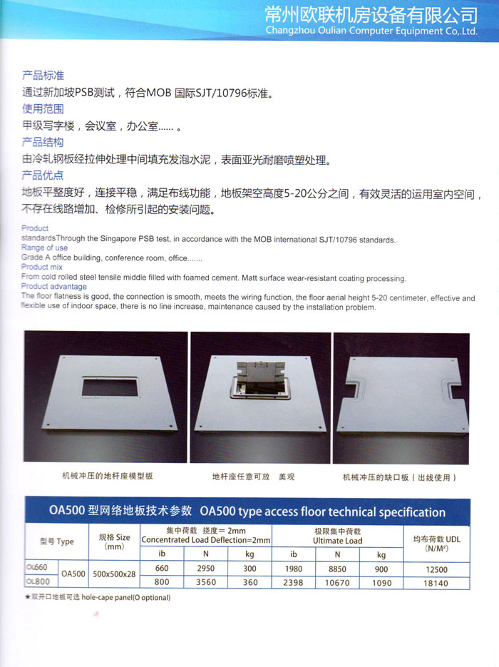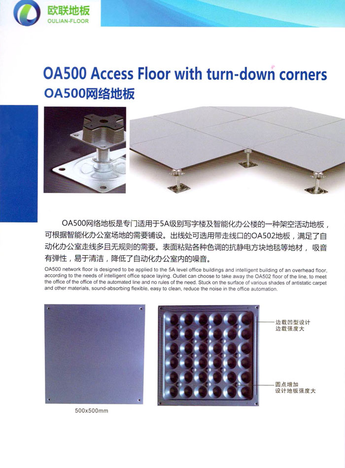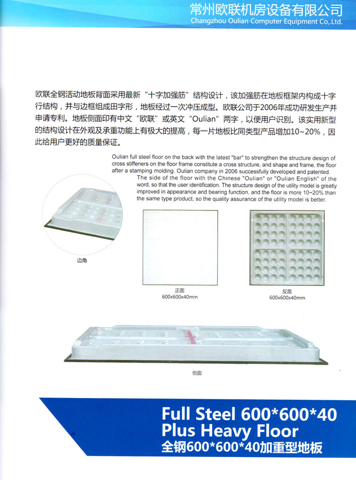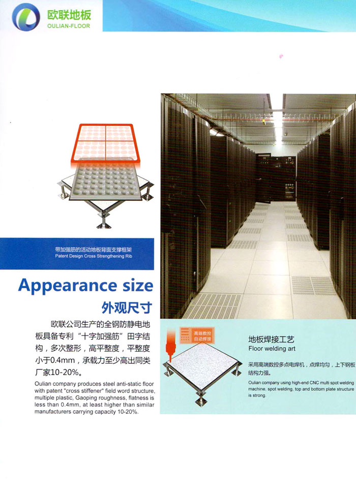 防靜電高架活動地板、全鋼地板、陶瓷地板是計算機行業(yè)發(fā)展起來的新型鋪地材料,隔離了潮氣、靜電灰塵,最重要的是解決了綜合布線問題,無需預(yù)埋管線,可隨時拆卸、搬移,保證了資訊設(shè)備完整的優(yōu)點,適應(yīng)了智能化樓宇中信息自動化技術(shù)對所處環(huán)境的特定要求,避免了廣大客戶的雙重投資,使現(xiàn)代化辦公程度更加高效,辦公場所更加舒適。 “歐聯(lián)”系列全鋼地板,符合國家安全要求,種類完備多樣,其中防靜電陶瓷地板、硫酸鈣地板等除具有普通瓷質(zhì)的裝飾和實用性外,其耐磨、防水、防火功能優(yōu)于其它同類產(chǎn)品,防靜電系列地板,能切合不同客戶的要求,其靈活的配置,深受客戶歡迎,不同材質(zhì)的地板結(jié)構(gòu)使設(shè)計師的設(shè)計空間比傳統(tǒng)的更加廣闊自由和善變。 公司大力發(fā)展國內(nèi)外銷售業(yè)務(wù),多次中標(biāo)國內(nèi)重點工程 ,例:哈爾濱醫(yī)科大學(xué)、山東大學(xué)、上海普通機場等。 公司將一如既往開發(fā)和制造一流的產(chǎn)品,愿與廣大有識之士合作發(fā)展,共創(chuàng)美好未來。