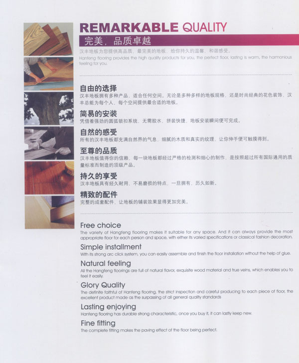 常州漢豐裝飾材料有限公司是一家涉及強化地板制造、屏風(fēng)鋁材生產(chǎn)、進(jìn)出口貿(mào)易的大型公司。2001年公司投入重資.全面引進(jìn)世界頂級一體化自動流水生產(chǎn)線和具有國際先進(jìn)水準(zhǔn)的德國權(quán)威木地板生產(chǎn)技術(shù),興建強化地板生產(chǎn)基地。多年以來.一直不斷加強生產(chǎn)設(shè)備、廠房基礎(chǔ)投入,目前公司年生產(chǎn)強化地板能力已經(jīng)達(dá)到了500萬平方米,步入國內(nèi)一流行列,具備了雄厚的國際競爭力。 漢豐地板以奉獻(xiàn)生活中最完美的地板為發(fā)展目標(biāo),時尚流行的設(shè)計風(fēng)格和多樣化的產(chǎn)品類型,贏得了市場的廣泛贊譽和肯定。產(chǎn)品嚴(yán)格按照歐洲標(biāo)準(zhǔn)檢測強化木地板的各項性能指標(biāo).達(dá)到百分百的國際技術(shù)標(biāo)準(zhǔn),確保了每一塊地板都有著上乘品質(zhì),是綠色環(huán)保的好地板。并先后通過了Isc)9001國際質(zhì)量管理體系認(rèn)證,IS014001國際環(huán)境管理體系認(rèn)證.中國環(huán)境標(biāo)志產(chǎn)品認(rèn)證,深得用戶的一致好評,是寫字樓、商場、大型超市、學(xué)校、建筑樓宇、娛樂場所、家用私宅等鋪裝的首選地板。