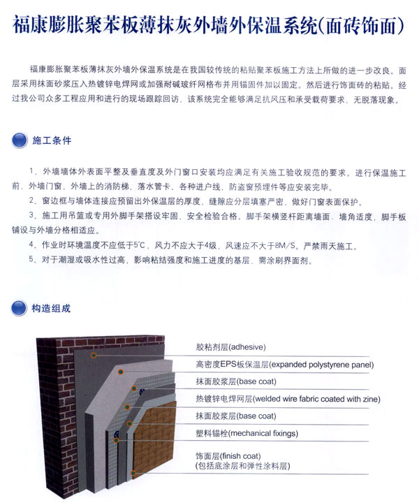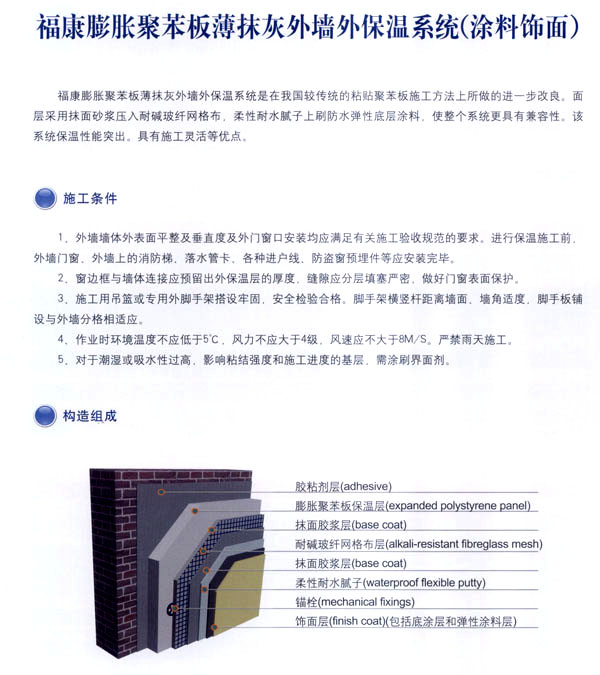 常州市?敌滦徒ú挠邢薰臼且匝兄崎_發(fā)、生產(chǎn)、銷售、施工、技術(shù)服務(wù)為一體的化學(xué)建筑材料的專業(yè)企業(yè),通過與歐洲著 名建筑材料公司和國內(nèi)權(quán)威科研機構(gòu)合作,并聘請國家級專家為技術(shù)顧問,開發(fā)出適合我國市場的?礒PS、XPS及聚苯顆粒外墻外保溫節(jié)能系統(tǒng)。 公司的生產(chǎn)線全部采用國內(nèi)先進的電腦控制自動化設(shè)備,配備了專業(yè)的實驗中心,并且采用進口的可再分散乳膠粉為基料,確保?低鈮ν獗毓(jié)能系統(tǒng)具有性能優(yōu)異、安全可靠,綠色環(huán)保、適用性強的高品質(zhì)特點。 公司開發(fā)的\'?低鈮ν獗叵到y(tǒng)\'被列為江蘇省科技成果推廣項目。整個生產(chǎn)流程依照質(zhì)量體系的要求,實行嚴(yán)格的監(jiān)控和檢測,為生產(chǎn)優(yōu)質(zhì)產(chǎn)品提供保證。高品質(zhì)的福康外墻外保溫系統(tǒng),提供從熱工設(shè)計、產(chǎn)品開發(fā)、生產(chǎn)銷售及工程施工全程服務(wù)的一體化解決方案。 公司本著“綠色環(huán)保、節(jié)約能源、造福人類”的理念。用我們一流的產(chǎn)品和優(yōu)秀的服務(wù),打造出一個個節(jié)能康居示范工程,為人類營造出舒適健康的居住環(huán)境。我們愿為中國節(jié)能事業(yè)的發(fā)展積極努力,更上一層樓。 公司組建高效的生產(chǎn)經(jīng)營管理模式,設(shè)立專業(yè)技術(shù)服務(wù)機構(gòu)。配備售后的優(yōu)質(zhì)服務(wù)。實行原材料、運輸、安裝一條龍服務(wù)。經(jīng)本公司施工之后,貴公司可以直接批涂料、裝門窗、貼瓷磚,保證絕無任何質(zhì)量問題。