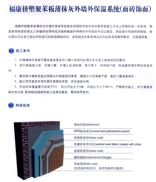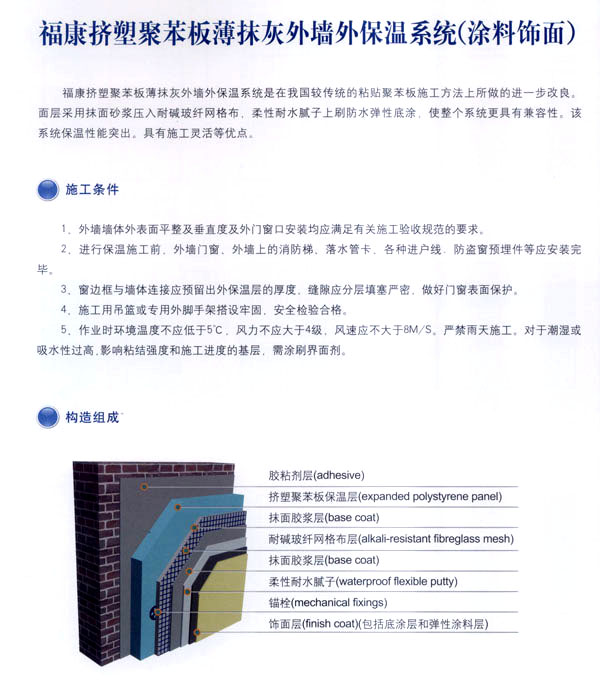 常州市福康新型建材有限公司是以研制開發(fā)、生產(chǎn)、銷售、施工、技術服務為一體的化學建筑材料的專業(yè)企業(yè),通過與歐洲著 名建筑材料公司和國內(nèi)權威科研機構合作,并聘請國家級專家為技術顧問,開發(fā)出適合我國市場的?礒PS、XPS及聚苯顆粒外墻外保溫節(jié)能系統(tǒng)。 公司的生產(chǎn)線全部采用國內(nèi)先進的電腦控制自動化設備,配備了專業(yè)的實驗中心,并且采用進口的可再分散乳膠粉為基料,確保?低鈮ν獗毓(jié)能系統(tǒng)具有性能優(yōu)異、安全可靠,綠色環(huán)保、適用性強的高品質(zhì)特點。 公司開發(fā)的\'福康外墻外保溫系統(tǒng)\'被列為江蘇省科技成果推廣項目。整個生產(chǎn)流程依照質(zhì)量體系的要求,實行嚴格的監(jiān)控和檢測,為生產(chǎn)優(yōu)質(zhì)產(chǎn)品提供保證。高品質(zhì)的福康外墻外保溫系統(tǒng),提供從熱工設計、產(chǎn)品開發(fā)、生產(chǎn)銷售及工程施工全程服務的一體化解決方案。 公司本著“綠色環(huán)保、節(jié)約能源、造福人類”的理念。用我們一流的產(chǎn)品和優(yōu)秀的服務,打造出一個個節(jié)能康居示范工程,為人類營造出舒適健康的居住環(huán)境。我們愿為中國節(jié)能事業(yè)的發(fā)展積極努力,更上一層樓。 公司組建高效的生產(chǎn)經(jīng)營管理模式,設立專業(yè)技術服務機構。配備售后的優(yōu)質(zhì)服務。實行原材料、運輸、安裝一條龍服務。經(jīng)本公司施工之后,貴公司可以直接批涂料、裝門窗、貼瓷磚,保證絕無任何質(zhì)量問題。