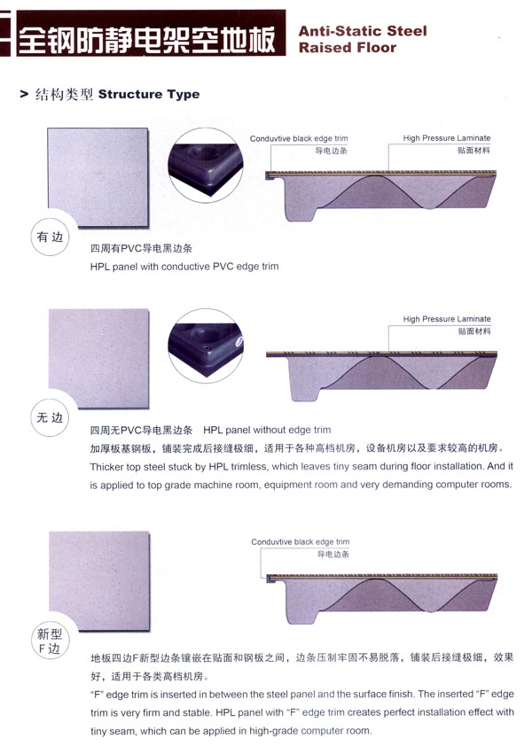 公司廠區(qū)面積30000平方米,擁有全鋼地板生產(chǎn)線兩條,木基、硫酸鈣基地板生產(chǎn)線各一條,年綜合產(chǎn)能100萬(wàn)平方米。生產(chǎn)蘇杰牌防靜電地板系列和蘇杰牌網(wǎng)絡(luò)地板系列,主要產(chǎn)品有全鋼防靜電架空地板、全鋼OA網(wǎng)絡(luò)地板、瓷磚貼面防靜電地板、硫酸鈣防靜電地板、木基防靜電地板、鋁合金防靜電地板、防靜電通風(fēng)地板等。