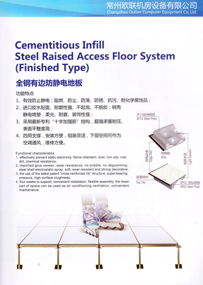 防靜電高架活動(dòng)地板、全鋼地板、陶瓷地板是計(jì)算機(jī)行業(yè)發(fā)展起來(lái)的新型鋪地材料,隔離了潮氣、靜電灰塵,最重要的是解決了綜合布線問(wèn)題,無(wú)需預(yù)埋管線,可隨時(shí)拆卸、搬移,保證了資訊設(shè)備完整的優(yōu)點(diǎn),適應(yīng)了智能化樓宇中信息自動(dòng)化技術(shù)對(duì)所處環(huán)境的特定要求,避免了廣大客戶的雙重投資,使現(xiàn)代化辦公程度更加高效,辦公場(chǎng)所更加舒適。 “歐聯(lián)”系列全鋼地板,符合國(guó)家安全要求,種類完備多樣,其中防靜電陶瓷地板、硫酸鈣地板等除具有普通瓷質(zhì)的裝飾和實(shí)用性外,其耐磨、防水、防火功能優(yōu)于其它同類產(chǎn)品,防靜電系列地板,能切合不同客戶的要求,其靈活的配置,深受客戶歡迎,不同材質(zhì)的地板結(jié)構(gòu)使設(shè)計(jì)師的設(shè)計(jì)空間比傳統(tǒng)的更加廣闊自由和善變。 公司大力發(fā)展國(guó)內(nèi)外銷售業(yè)務(wù),多次中標(biāo)國(guó)內(nèi)重點(diǎn)工程 ,例:哈爾濱醫(yī)科大學(xué)、山東大學(xué)、上海普通機(jī)場(chǎng)等。 公司將一如既往開(kāi)發(fā)和制造一流的產(chǎn)品,愿與廣大有識(shí)之士合作發(fā)展,共創(chuàng)美好未來(lái)。