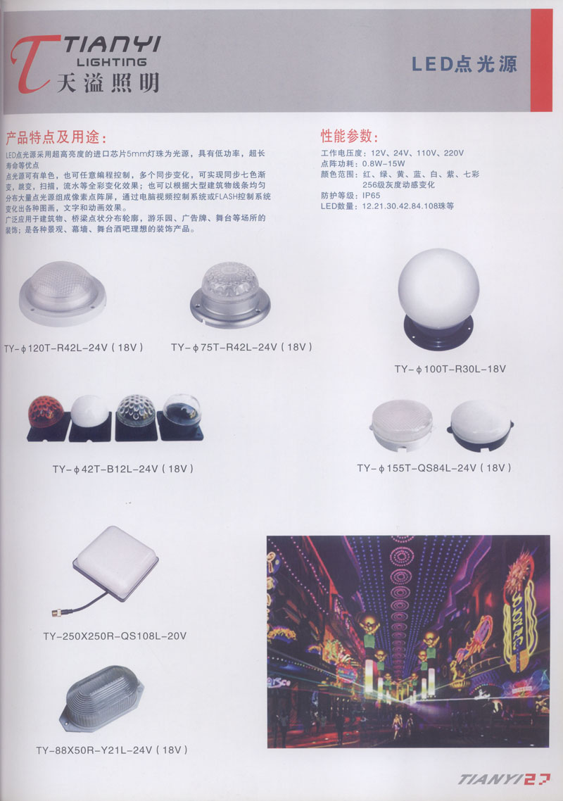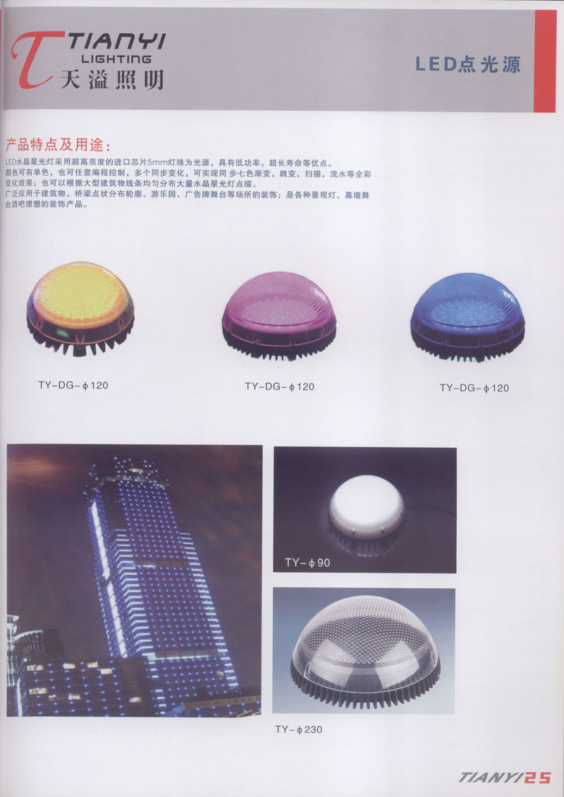 天溢照明是中國領(lǐng)先的專業(yè)從事LED廣告照明裝飾燈具設(shè)計(jì)、系統(tǒng)開發(fā)、燈具制造、工程服務(wù)一體的專業(yè)型公司,本公司產(chǎn)品已廣泛應(yīng)用于全國大多數(shù)城市夜景亮化景觀照明、酒店休閑娛樂夜場夢幻燈光、戶內(nèi)外廣告宣傳、建筑及室內(nèi)照明以及家居裝飾等場合。